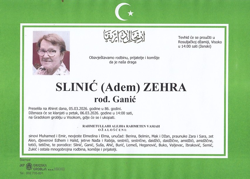 SLINIĆ (Adem) ZEHRA 06.03.2026. u 14:00 sati