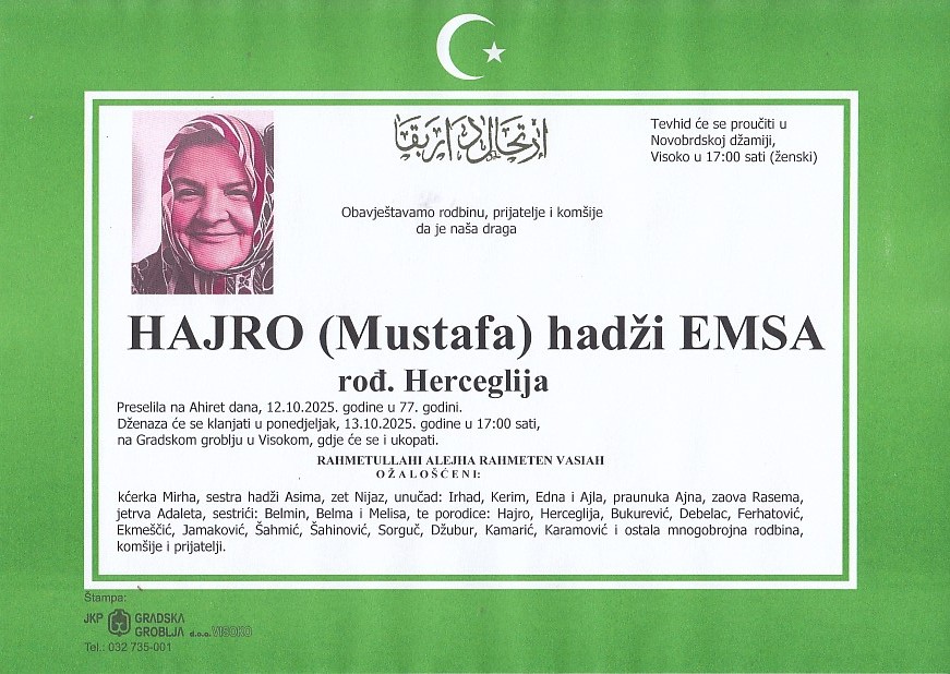 HAJRO (Mustafa) hadži EMSA 13.10.2025. u 17:00 sati