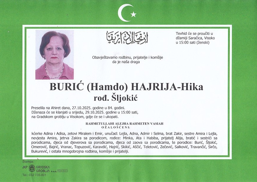 BURIĆ (Hamdo) HAJRIJA- Hika 29.10.2025. u 15:00 sati