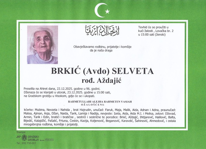 BRKIĆ (Avdo) SELVETA 23.12.2025. u 15:00 sati
