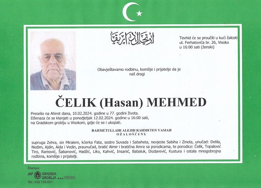 ČELIK (Hasan) MEHMED 12.02.2024. godine u 16:00 sati