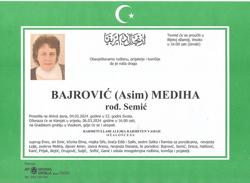 BAJROVIĆ (Asim) MEDIHA 06.03.2024. godine u 16:00 sati