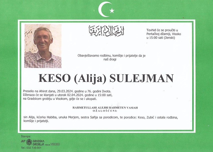 KESO (Alija) SULEJMAN 02.04.2024. godine u 15:00 sati