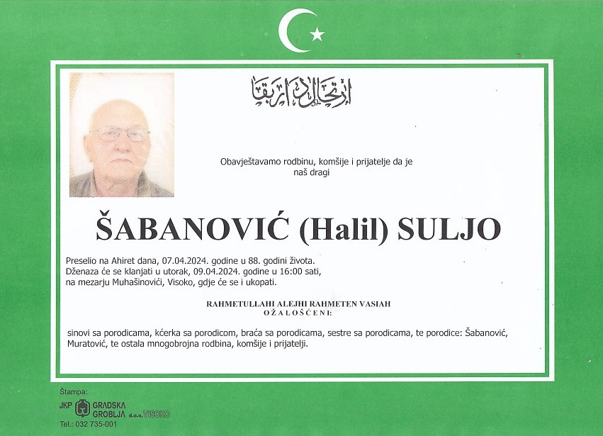 ŠABANOVIĆ (Halil) SULJO 09.04.2024. godine u 16:00 sati