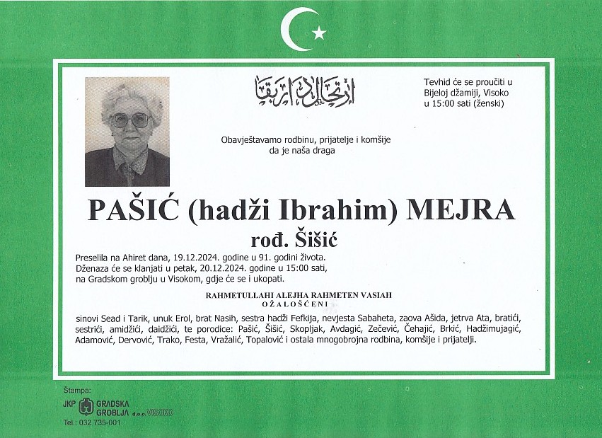 PAŠIĆ (Ibrahim) MEJRA 20.12.2024. godine u 15:00 sati