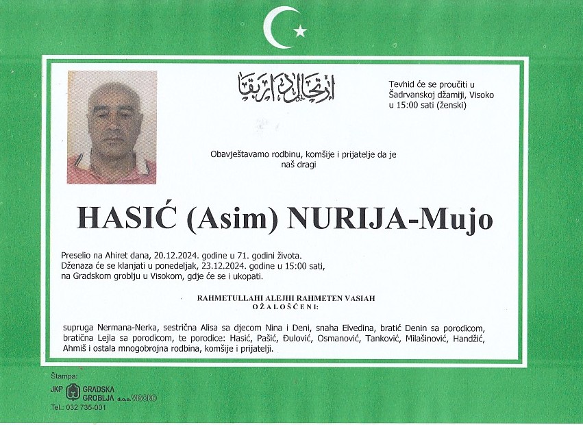 HASIĆ (Asim) NURIJA 23.12.2024. godine u 15:00 sati