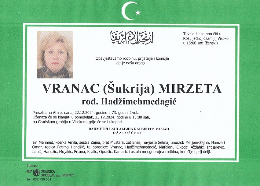 VRANAC (Šukrija) MIRZETA 23.12.2024. godine u 15:00 sati