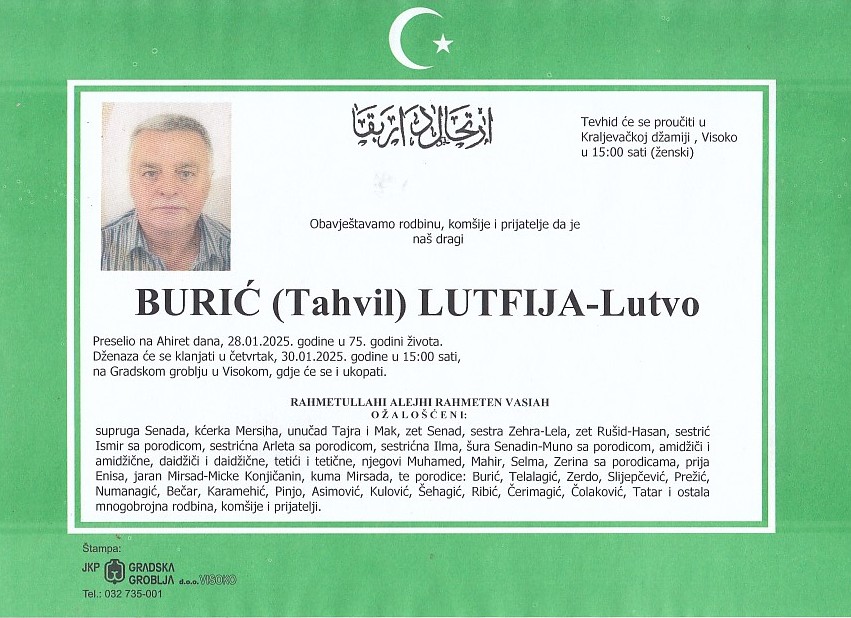 BURIĆ (Tahvil) LUTFIJA-Lutvo 30.01.2025. godine u 15:00 sati