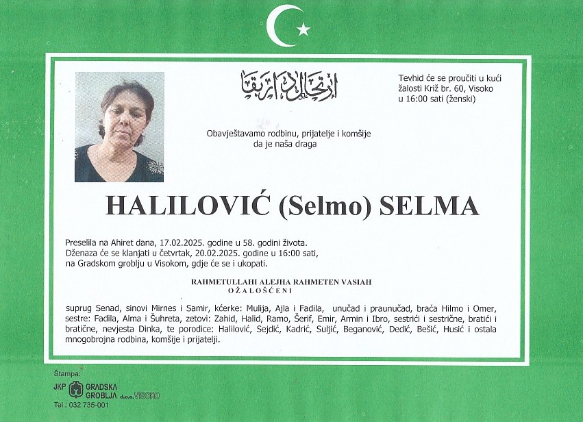 HALILOVIĆ (Selmo) SELMA 20.02.2025. godine u 16:00 sati