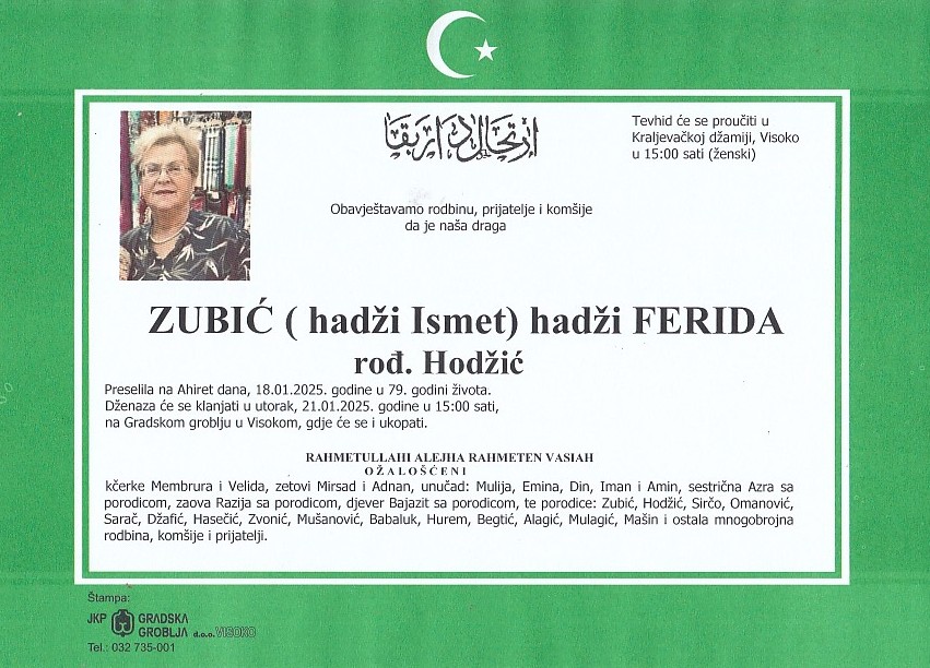 ZUBIĆ (Ismet) FERIDA 21.01.2025. godine u 15:00 sati