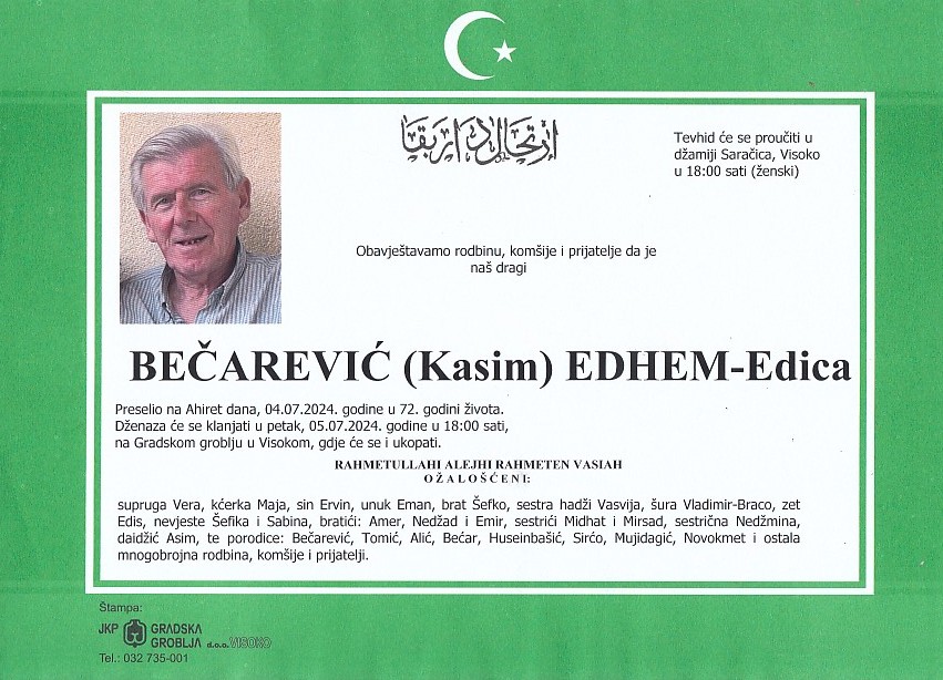 BEČAREVIĆ (Kasim) EDHEM 05.07.2024. godine u 18:00 sati