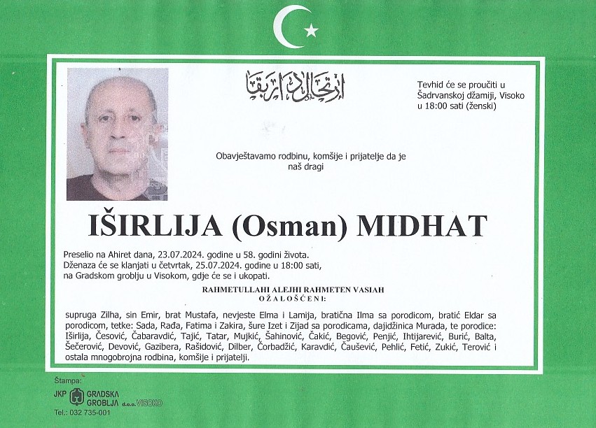 IŠIRLIJA (Osman) MIDHAT 25.07.2024. godine u 18:00 sati