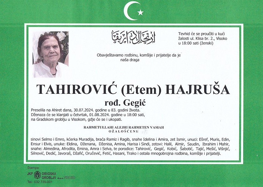 TAHIROVIĆ (Etem) HAJRUŠA 01.08.2024. godine u 18:00 sati