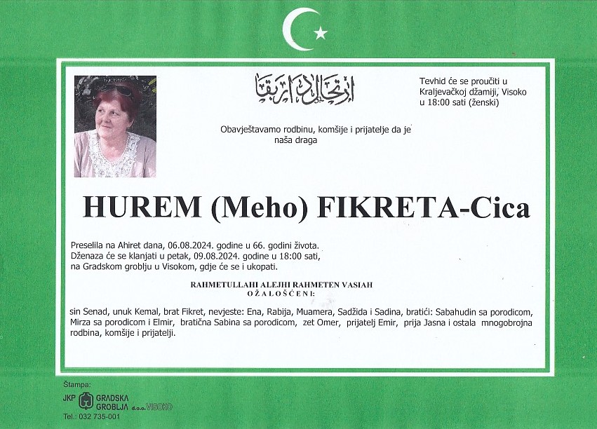 HUREM (Meho) FIKRETA 09.08.2024. godine u 18:00 sati