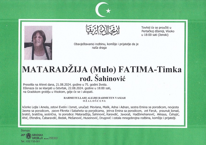MATARADŽIJA (Mulo) FATIMA 22.08.2024. godine u 18:00 sati