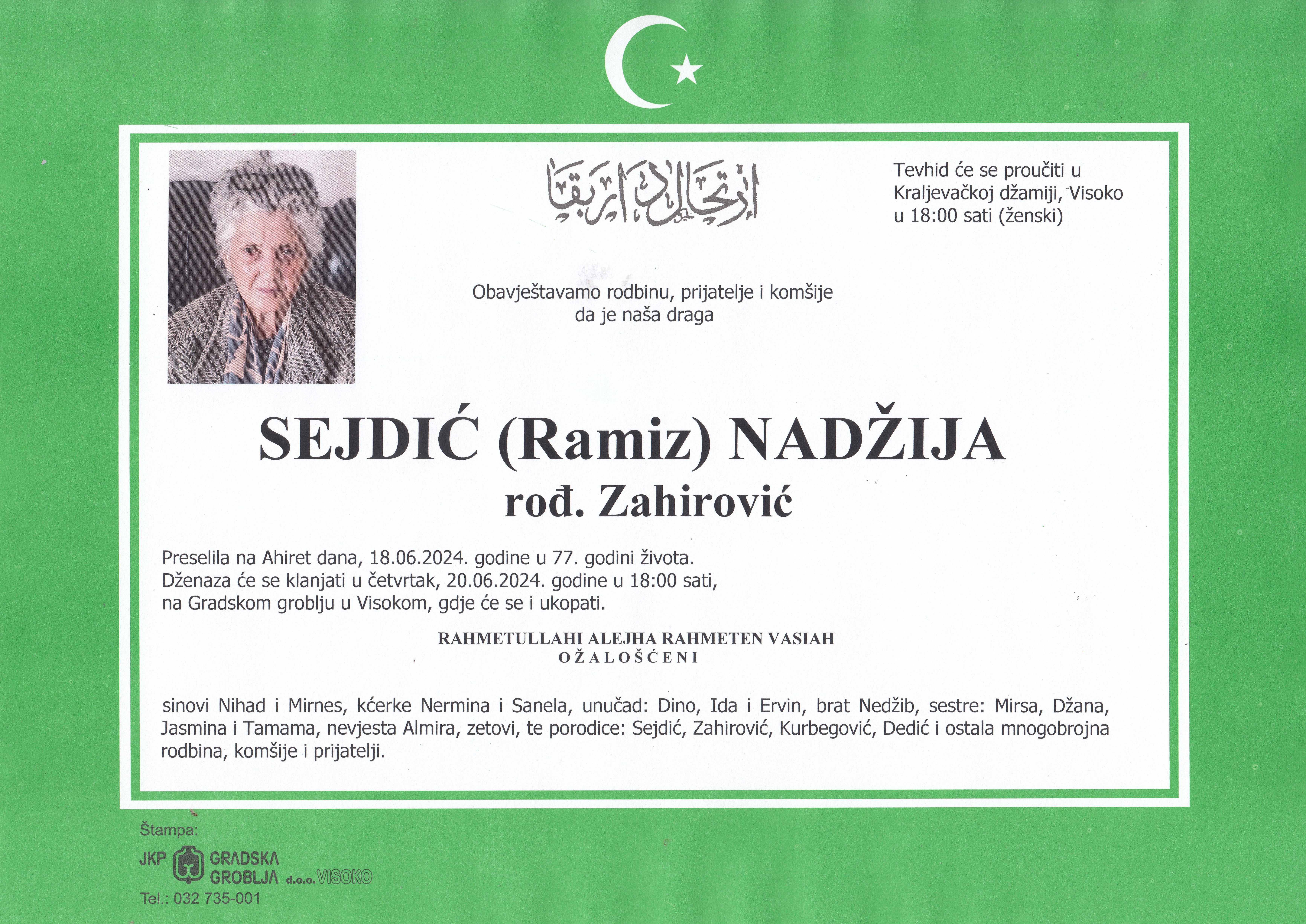 SEJDIĆ (Ramiz) NADŽIJA 20.06.2024. godine u 18:00 sati