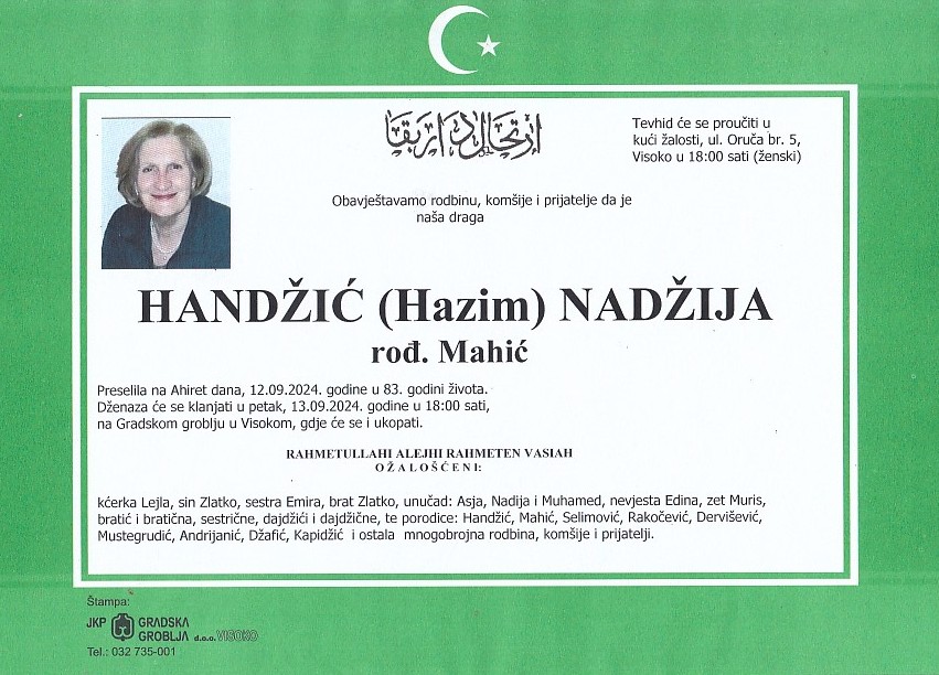 HANDŽIĆ (Hazim) NADŽIJA 13.09.2024. godine u 18:00 sati