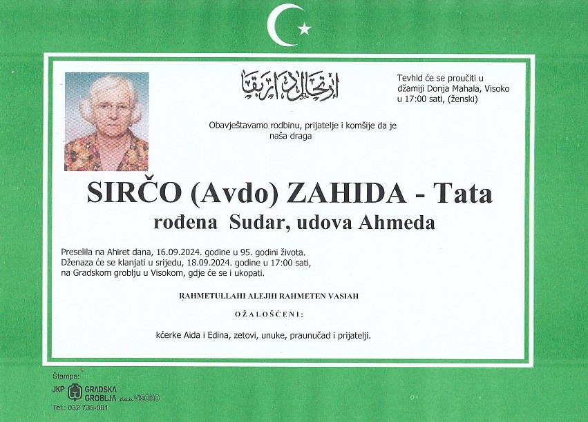 SIRČO (Avdo) ZAHIDA 18.09.2024. godine u 17:00 sati
