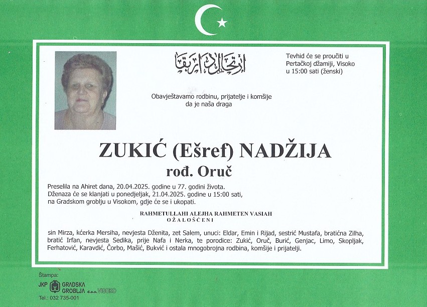 ZUKIĆ (Ešref) NADŽIJA 21.04.2025. godine u 15:00 sati