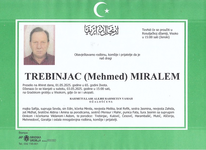TREBINJAC (Mehmed) MIRALEM 03.05.2025. godine u 15:00 sati