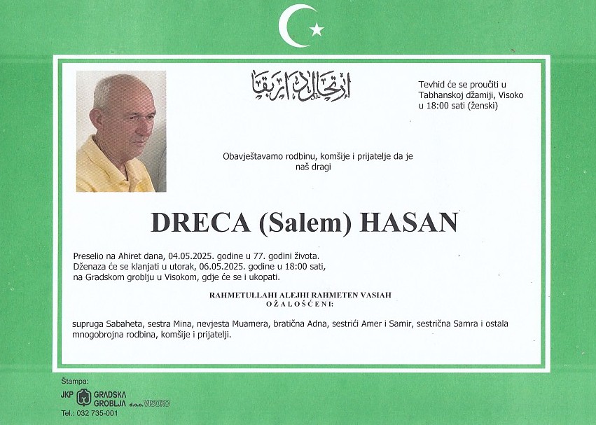 DRECA (Salem) HASAN 06.05.2025. godine u 18:00 sati