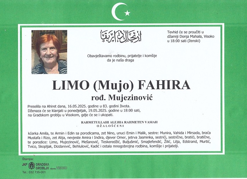 LIMO (Mujo) FAHIRA 19.05.2025. godine u 18:00 sati