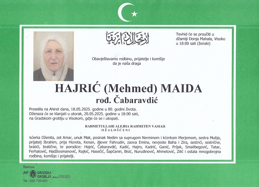 HAJRIĆ (Mehmed) MAIDA 20.05.2025. godine u 18:00 sati