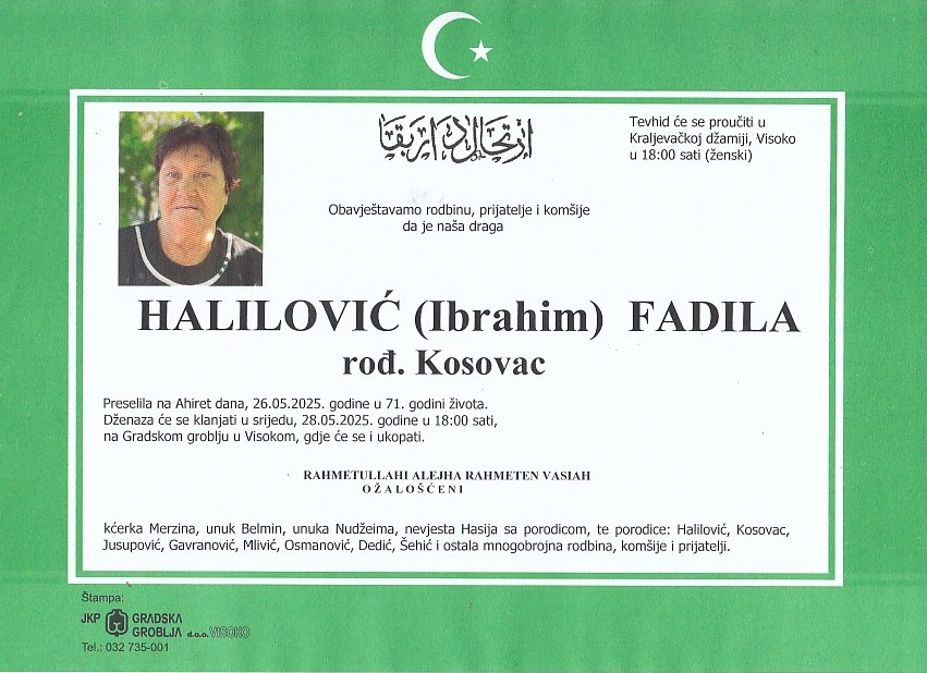 HALILOVIĆ (Ibrahim) FADILA 28.05.2025. godine u 18:00 sati