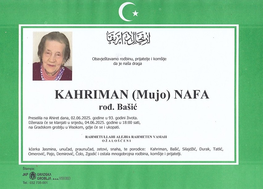 KAHRIMAN (Mujo) NAFA 04.06.2025. godine u 18:00 sati