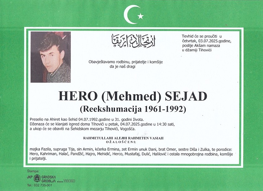 HERO (Mehmed) SEJAD 04.07.2025. godine u 14:30 sati