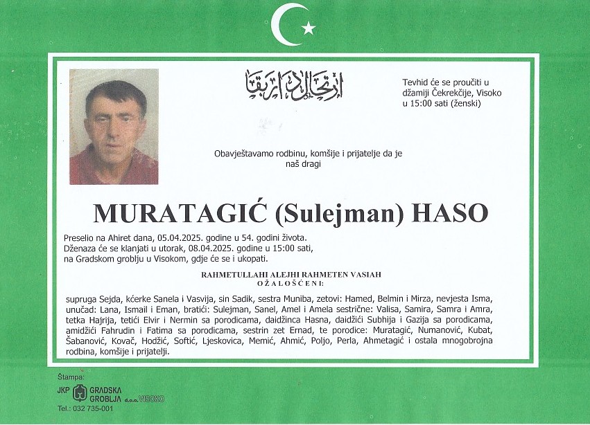 MURATAGIĆ (Sulejman) HASO 08.04.2025. godine u 15:00 sati