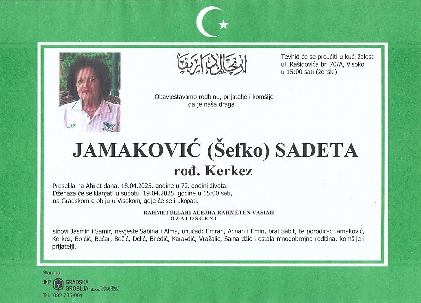 JAMAKOVIĆ (Šefko) SADETA 19.04.2025. godine u 15:00 sati