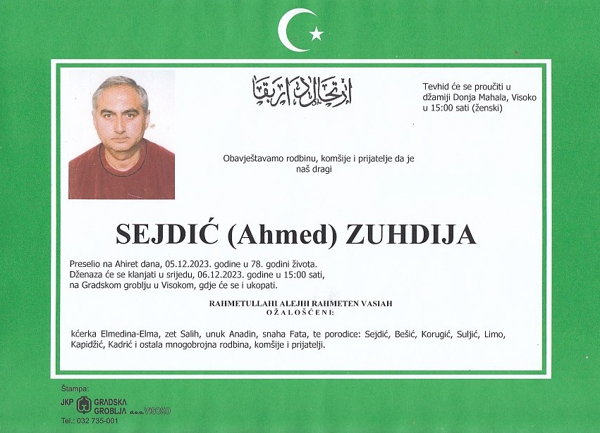 SEJDIĆ (Ahmed) ZUHDIJA 06.12.2023. godine u 15:00 sati