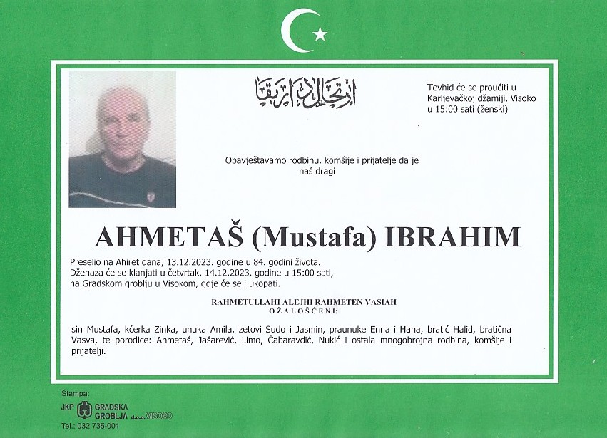AHMETAŠ (Mustafa) IBRAHIM 14.12.2023. godine u 15:00 sati