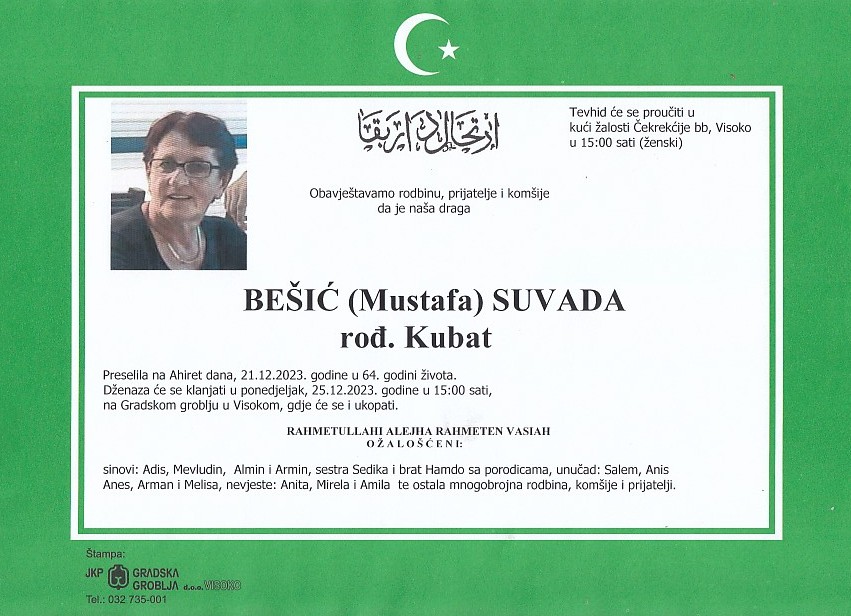 BEŠIĆ (Mustafa) SUVADA 25.12.2023. godine u 15:00 sati
