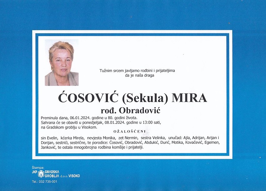 ĆOSOVIĆ (Sekula) MIRA 08.01.2024. godine u 13:00 sati