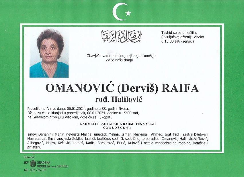 OMANOVIĆ (Derviš) RAIFA 08.01.2024. godine u 15:00 sati