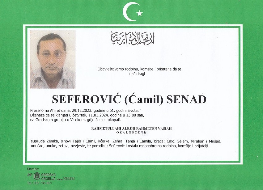 SEFEROVIĆ (Ćamil) SENAD 11.01.2024. godine u 13:00 sati