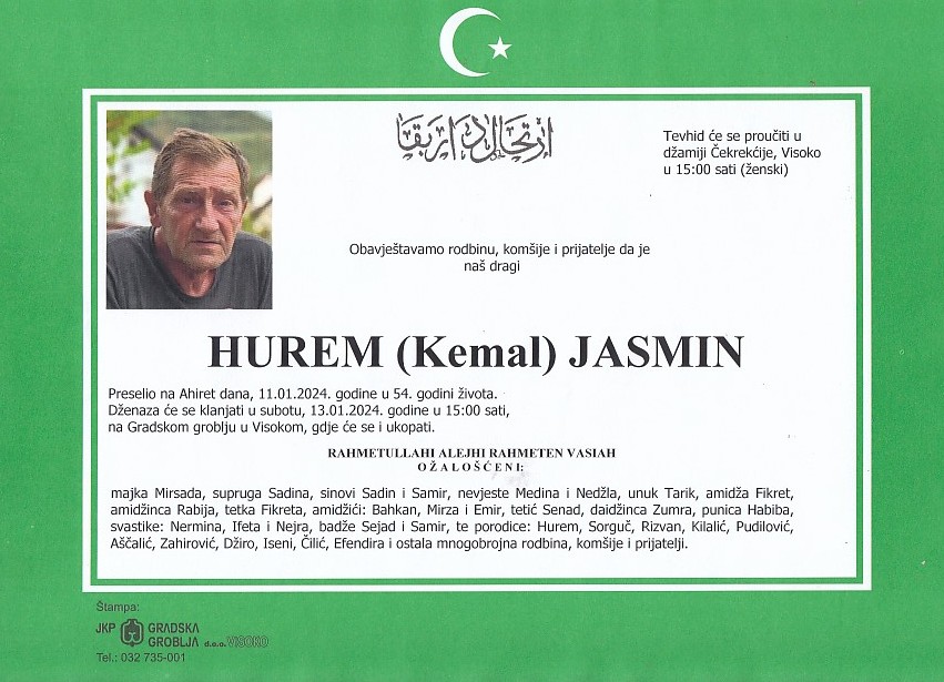 HUREM (Kemal) JASMIN 13.01.2024. godine u 15:00 sati