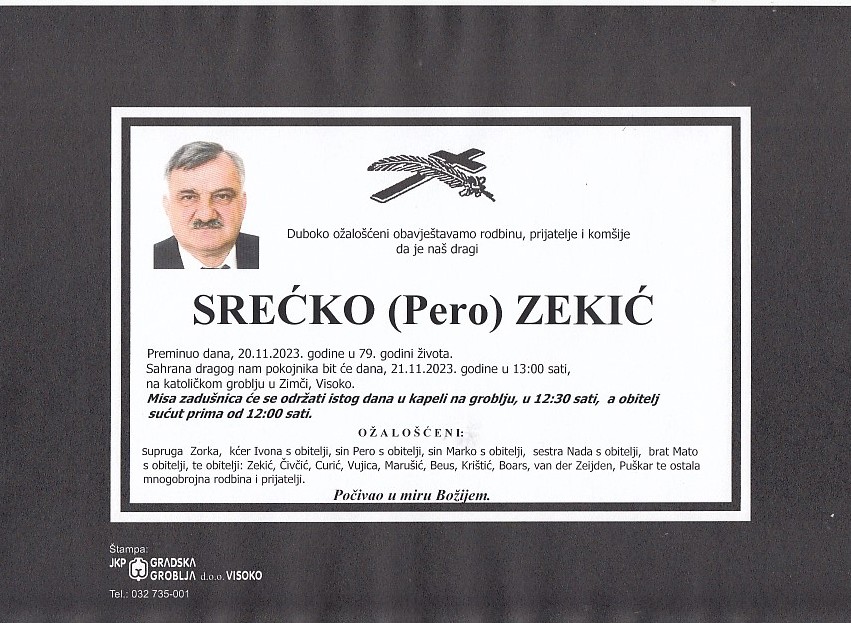 SREĆKO (Pero) ZEKIĆ 21.11.2023. godine u 13:00 sati