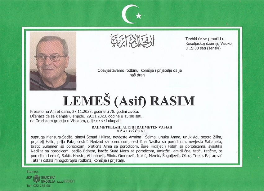 LEMEŠ (Asif) RASIM 29.11.2023. godine u 15:00 sati