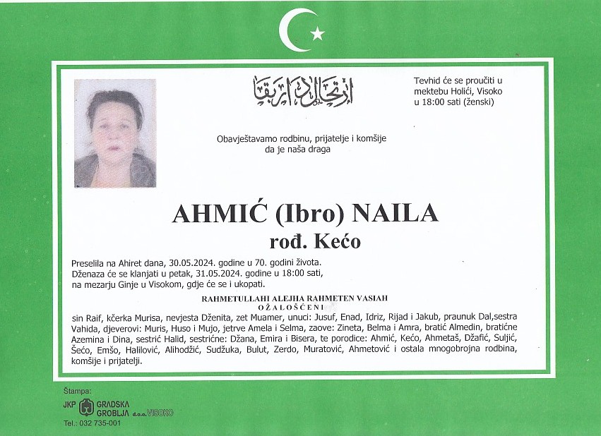 AHMIĆ (Ibro) NAILA 31.05.2024. godine u 18:00 sati