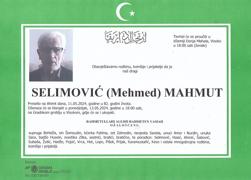 SELIMOVIĆ (Mehmed) MAHMUT 13.05.2024. godine u 18:00 sati