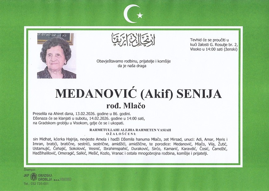 MEDANOVIĆ (Akif) SENIJA 14.02.2026. u 14:00 sati