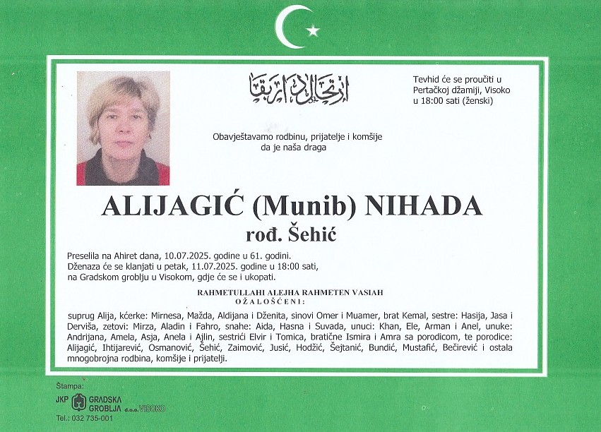 ALIJAGIĆ (Munib) NIHADA 11.07.2025. godine u 18:00 sati