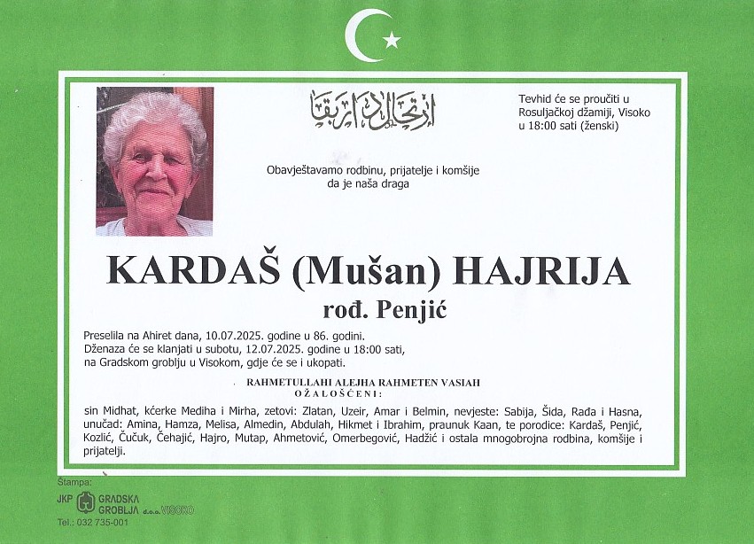KARDAŠ (Mušan) HAJRIJA 12.07.2025. godine u 18:00 sati