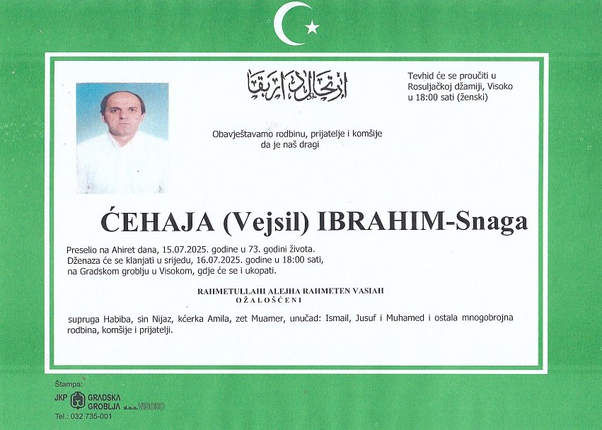 ĆEHAJA (Vejsil) IBRAHIM 16.07.2025. godine u 18:00 sati