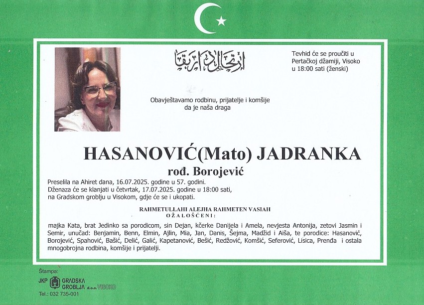 HASANOVIĆ (Mato) JADRANKA 17.07.2025. godine u 18:00 sati
