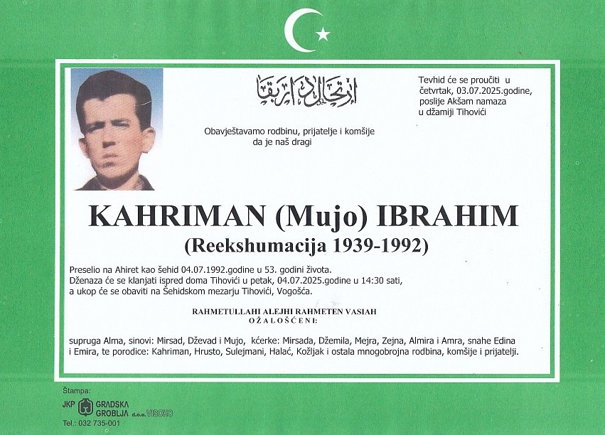 KAHRIMAN (Mujo) IBRAHIM 04.07.2025. godine u 14:30 sati
