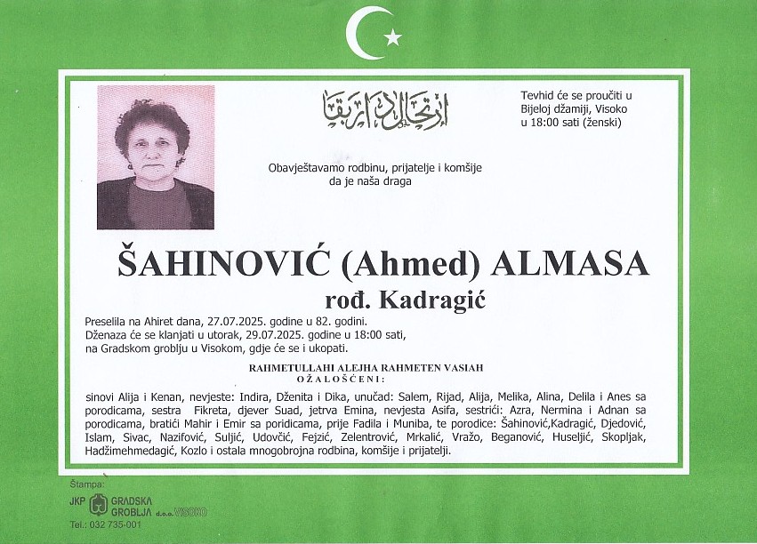 ŠAHINOVIĆ (Ahmed) ALMASA 29.07.2025. u 18:00 sati